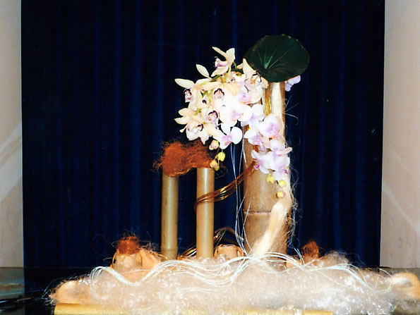 29日のいけ花デモンストレーションは、タッソー劇場の舞台上で行なわれました。日本のイメージを竹の花器と水引で、ソレントの海のブルーと白波のイメージをいけ花で表現して好評を博すことができました。会場のエントランスに置かれた作品は多くの方々がご覧になり写真を撮られていました。
