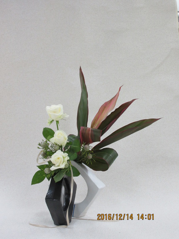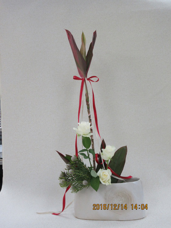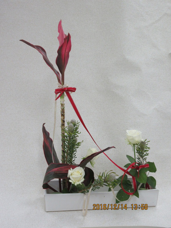 12月14日神田神保町のお教室で、研究会と理事会が行われました。安藤恵子教授の担当で、白薔薇、ドラセナ、ジェイロパールにリボンを添えてクリスマスを生け、それぞれ個性的な作品が出来上がりました。