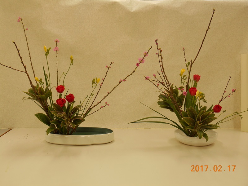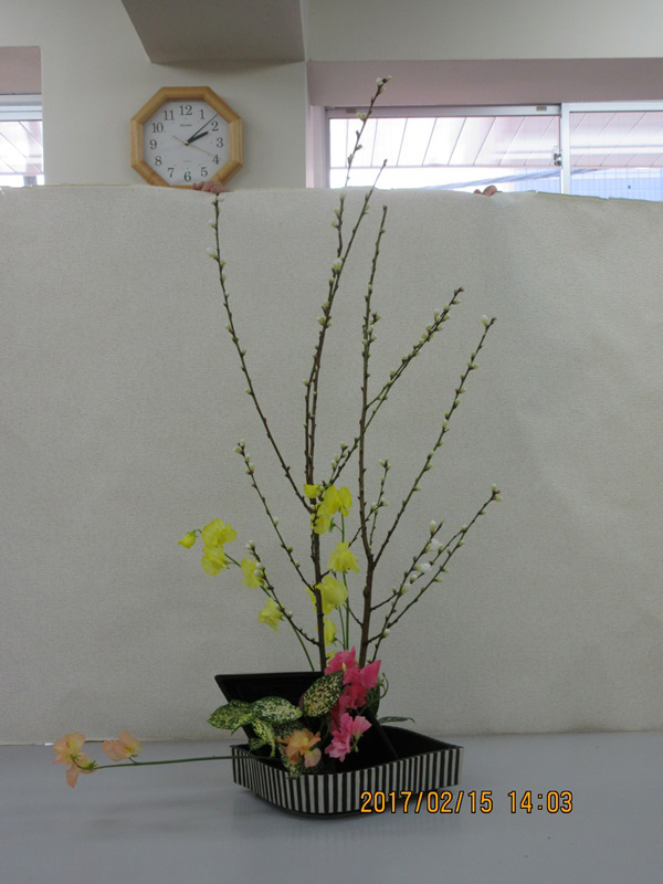 増田三千代教授指導の2月レッサム・フィリリ教室は「早春のいけばな」という題名で、レンギョウとスイートピーの黄色とピンクを花材に、線を生かして軽やかなお花をいけました。12名参加。