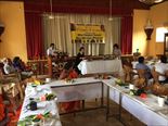 7月15日、ガンパハにあるソーマシリさんのお寺・平和寺で、いけ花デモンストレーションを行い、その後2回に分けていけ花体験をしました。平和寺はとても広く、幼稚園や僧侶になるための学校、イベントのできるホールもあり、教育の場にもなっていました。今回のいけ花イベントの垂れ幕がお寺の外や室内に飾られ、日本のいけばなに興味のある100人位の方が熱心にお稽古されました。各自マグカップを持参していただき、オアシスをセットしてアルストロメリア、クロトン、その他お庭から取ってもってこられたアンスリウム等の花やお寺の葉ものなどもアレンジして楽しまれました。ガンパハのライオンズクラブの会長Mr. Sunil Wanasingheさんも大変喜ばれ、是非来年も来てくださいとのお言葉を頂戴しました。
