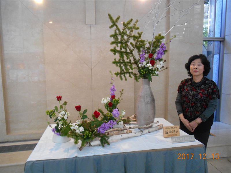 練馬区華道連盟要請で蒲田洋子理事長が練馬区庁舎アトリウムにクリスマスのいけ花を展示しました。花材は、バラ、ストック(紫・白)、ヒペリカム、リューカデンドロン、モミの木、シラカバでした。