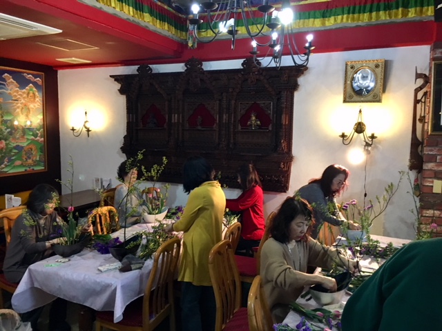 3月5日月曜日にネパール料理店レッサムフィリリで増田三千代教授の指導でいけ花のレッスンが行われ9名が参加しました。花材は 青文字、チューリップ、スターチスを使いました。青文字の枝ぶりを生かし春らしいチューリップをいけ、それぞれ素敵な作品が仕上がりました。