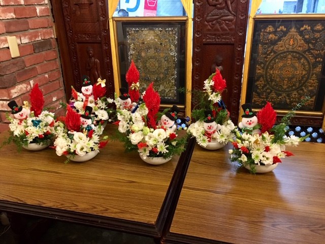 12月3日月曜日のレッサム・フィリリでのお稽古は、鈴木康子教授の指導でオーナメントを使った可愛らしいクリスマスアレンジメントを楽しみました。鶏頭の赤をツリーに見立て、白い花はトルコキキョウ、小菊などで雪をイメージ、雪だるまも最後に飾りました。赤白緑のクリスマスカラーも愛らしく、この日の参加者7名の作品を並べると、それぞれ個性が出ているのがよくわかりました。