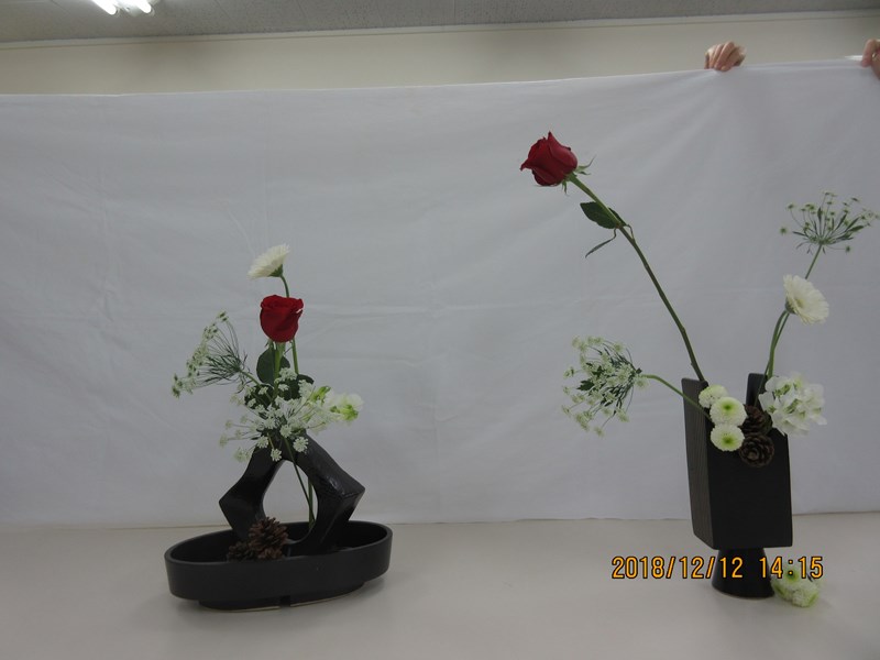 12月12日、寺西薫教授の担当で、「ホワイトクリスマス」というテーマで研究会が行われました。大きな紅い薔薇一輪を中心に、レースフラワー、白いガーベラ、白いポットマム、白いスイトピー、まつぼっくりを使って、それぞれが「メリークリスマス!」のメッセージを伝えるいけ花を創り上げました。