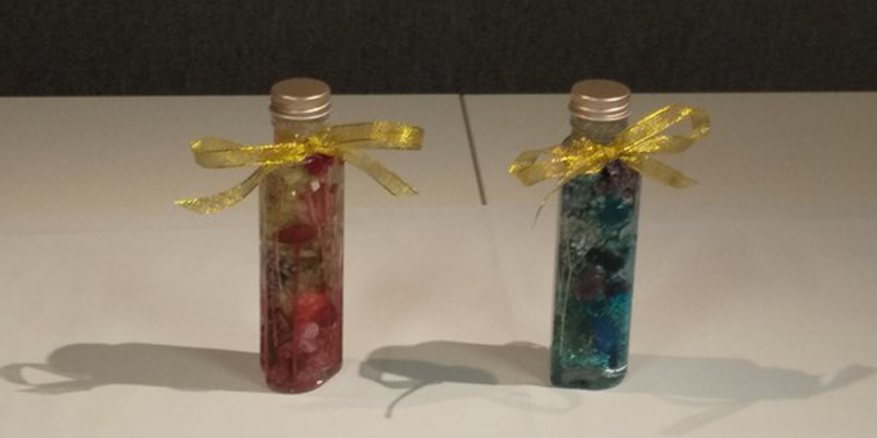 12月18日の研究会が、川崎和美教授の担当で、武蔵新城の川崎さん宅で行われました。まずレストランでランチ、そして街歩きを楽しみ、その後ご自宅のお部屋でお洒落なハーバリュウムを製作しました。ハートや丸形のガラスの容器にカラフルな小花やキラキラ飾りをピンセットで入れ、好みで青や赤の色のついたオイルを入れ、最後に透明のオイルをそそいで、しっかりと蓋をし、リボンを飾って完成しました。